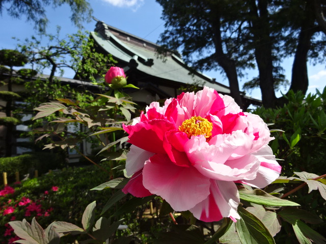 すでに散った花もありますが、境内に咲く牡丹の花が美しいです。
